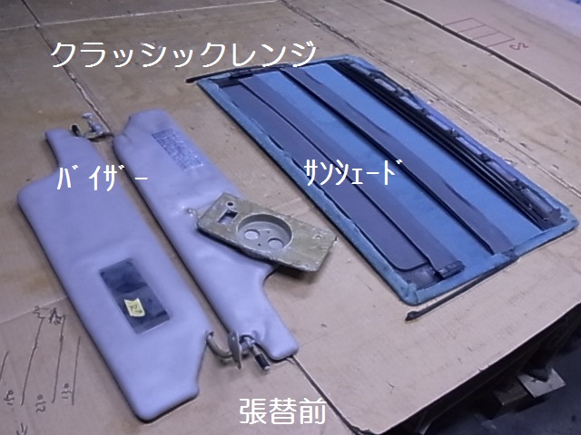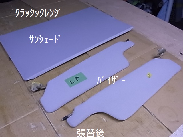 この画像が取っ手部分と、バイザー部分の凹凸部分を張り終えた画像です、サンルーフがある場合は最初に布地を切り抜くのではなく、最後に不要な部分を切り抜いた方が切り過ぎなどを防止出来ます。