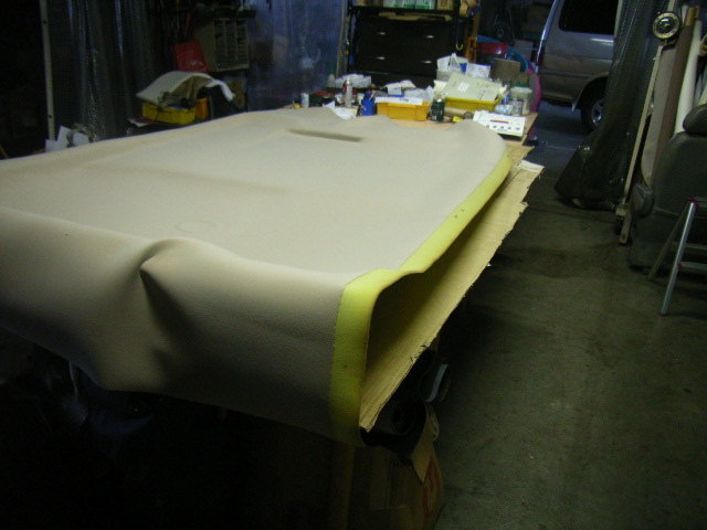 最後に天井を裏返して、回りの布地を裏側に接着して行きますが、表のしわの状態をみながら、しわが有る部分は強めに引っ張りしわが消えたのを確認しながら張って行きます。
