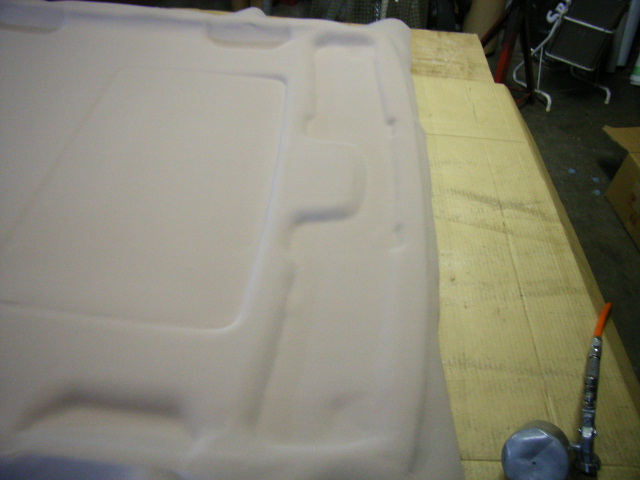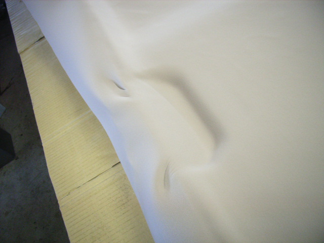 特に張替えで皆様が心配に思う取っ手や、バイザー部分の凹凸部分などは、部分部分で再スプレーしながら、張って行くときれいに接着出来ます、しわの問題ですが、この画像でお判りのように凹凸部分にはしわが有りませんが、外側の布地はしわになっております、これは凹凸部分に出来るしわを接着時点で外側にしわを逃がしているからです、このしわも裏側に引っ張る事により、きれいに無くなるのが分かると思います。