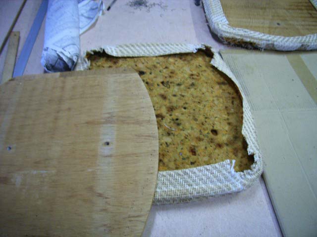 ベースの板とウレタン、表の布地がバラバラになりました、中のウレタンは長年の使用でペッチャンコになって座り心地も悪いので交換です。