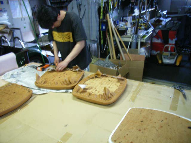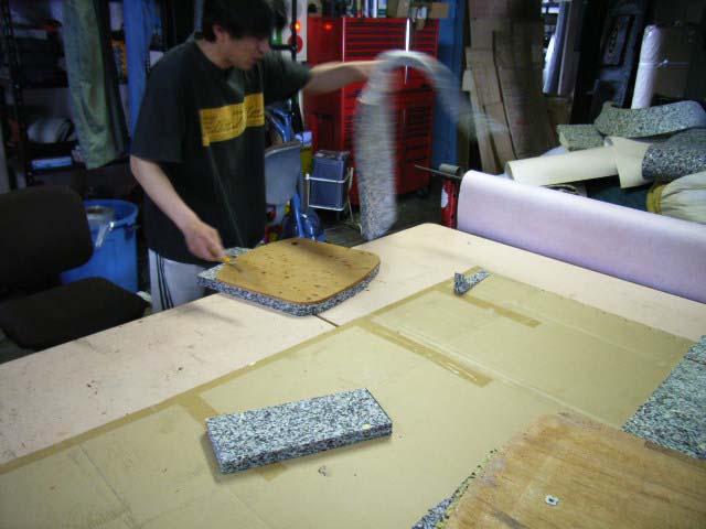 さて、いよいよ本番の表皮張りに入ります、今回は布地では無く合成レザー(120センチx120センチ約3500円で4台分取れました)をタッカーを利用して板に止めます、初めはしわだらけに張っていた相沢さんも2枚3枚と進むうちにこつをつかんだようです。