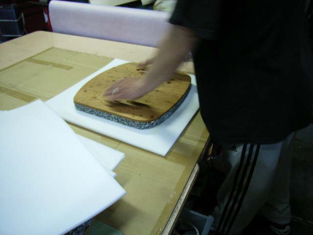 新しいウレタン(下地にミックス材硬めのウレタンを使用します)を型どうりにカットして板に張り付けます。使用したミックス材30ミリ(50センチx50センチで約800円)