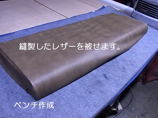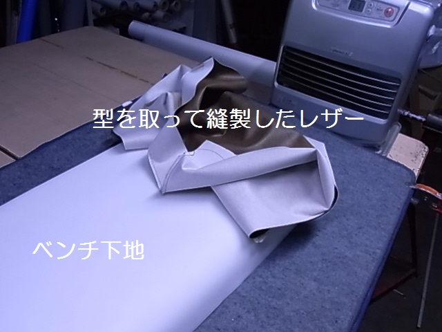 次に表皮に使用する合皮のレザーを型を取って裁断して縫製した物を被せます、寒い時期は一度レザーを温めましょう